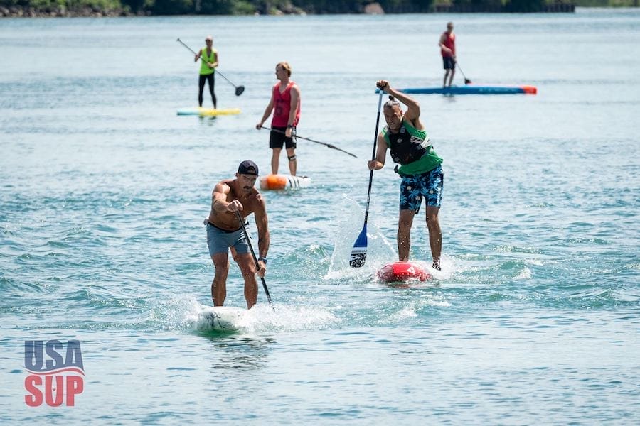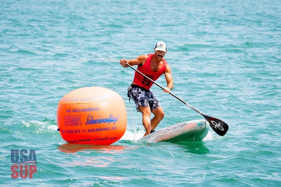 Yes during the 10k distance race I decided to use a narrow board because of the calm conditions. After a hectic mass start behind the sit crafts and getting pushed into the slower water I was able to find a draft train and make my way to the front of the pack. That’s when we rounded the top of the island and were confronted with a busy boat channel with massive cargo ships and very large yachts disrupting our calm conditions and causing me to fall back to 4th place. I had to switch from trying to break away to not falling, this lasted about 3k. With help from Steve Miller and Cam Carney we were able to close the gap on Campbell Carter and I pulled off 1st place with a sprint finish.