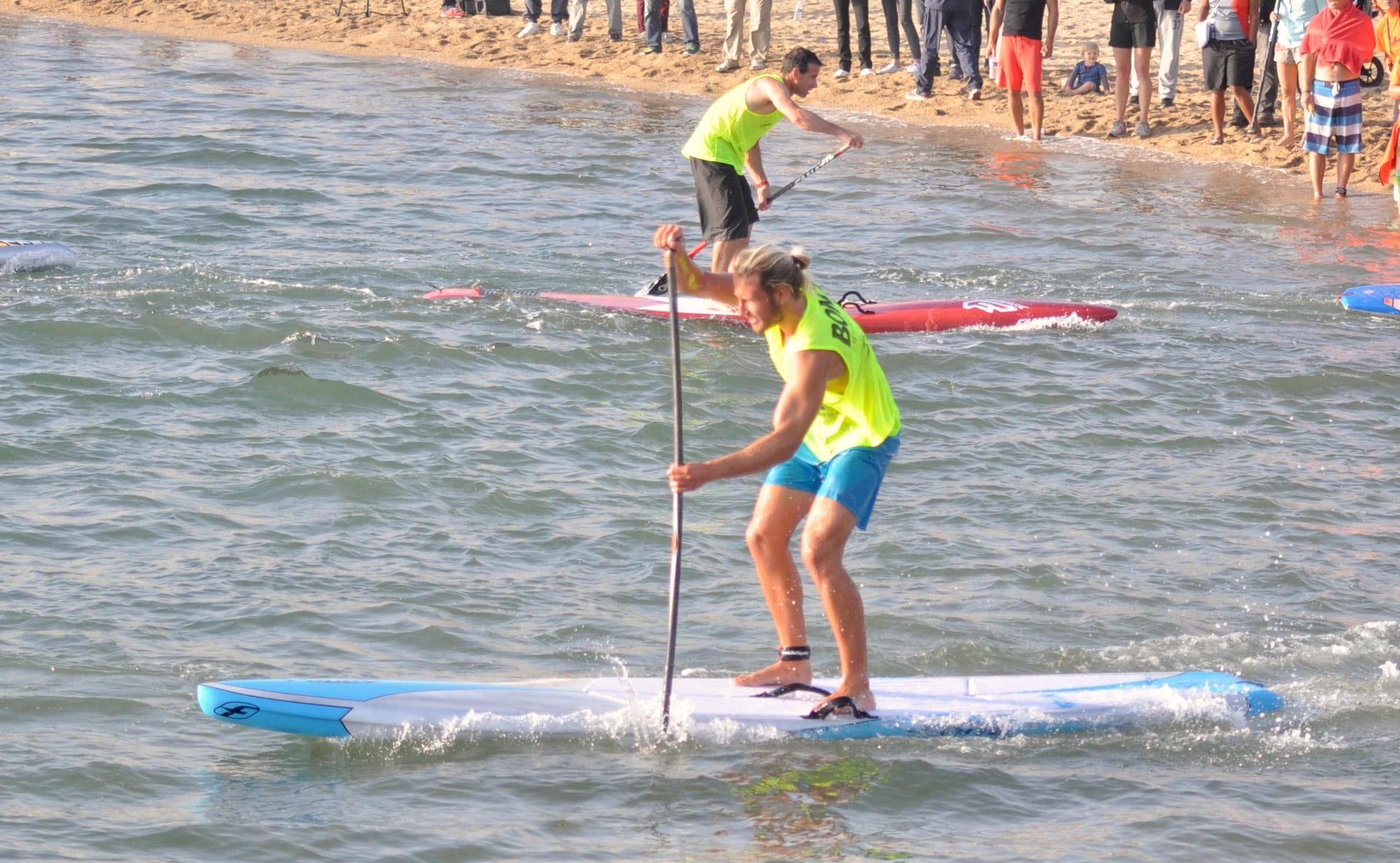 Comme pour Céline chez les filles, la domination de Titouan Puyo chez les hommes était flagrante pour ne pas dire déconcertante. Titouan Puyo a en effet une technique de rame tellement pure qu’elle donne l’impression qu’il ne force jamais. Et pourtant, à un coup de pagaie par seconde sur les 500 derniers mètres de la Longue Distance de 13 kilomètres, augmentant à chaque stroke son avance sur Arthur Arutkin, son dauphin pour la deuxième fois de la compétition, Titouan concluait un week-end parfaitement maîtrisé, couronné d’un double titre de Champion de France SUP Race 2015.