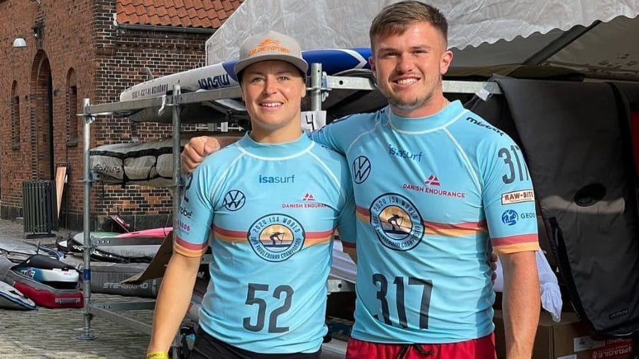 Emily Evans and Joey Jones representing Wales at the 2024 ISA World SUP Championships in Copenhagen, Denmark