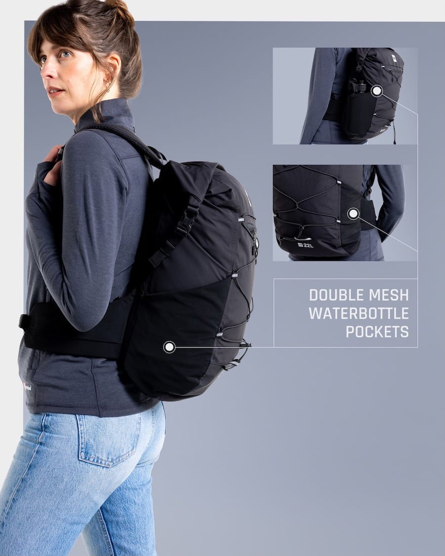 Generously sized double mesh bottle pockets fit oversized or multiple bottles, and the reinforced base adds durability. The padded waist straps include soft envelope-style pockets—perfect for small items you need quick access to—and the waist strap itself is mounted in front of the shoulder straps, so it can be clipped around the front of the bag when not in use.