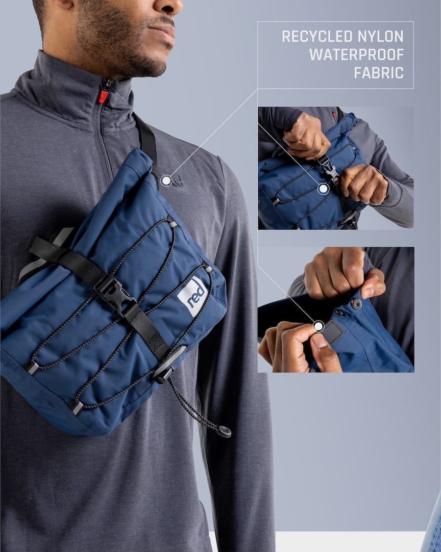 The Lightweight Crossbody Bag is a highly versatile companion, made from the same durable, waterproof fabric as our lightweight backpacks. Designed to be worn across the body, it also features concealed clip straps in the back pocket—allowing it to be securely attached to our backpacks, a paddle board, or even bike handlebars.