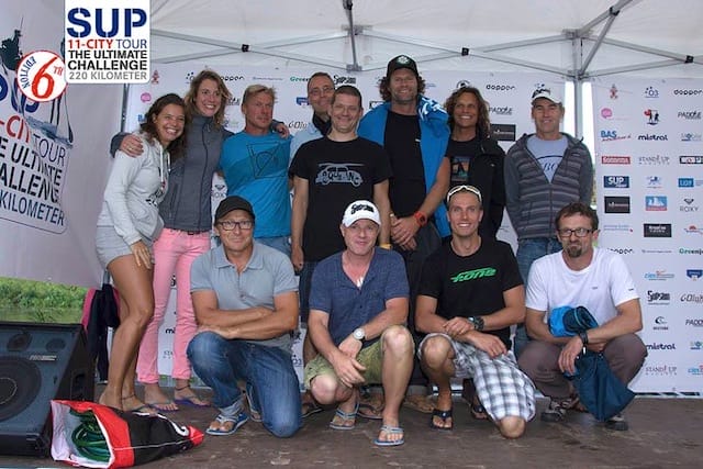 The SUP11-City NON-STOP tour racers. Mark Slater, standing, 3rd from left to right. Bottom right, Arnaud Frennet, winner of the event.